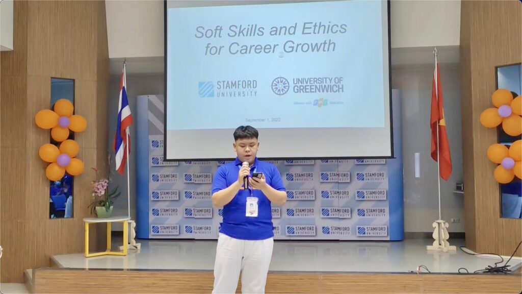 After the campus tour, students were warmly welcomed by Dr. Apitep Saekow (Acting President) and Dr. William Wall (Assistant President, Asoke Learning Center). The key session of the event was a Workshop delivered by Dr. William. The workshop topic was “Soft Skills & Ethics for Career Growth.” Stamford hopes that the workshop provided Greenwich Vietnam students valuable knowledge about how to improve their communication skills and about how important ethics are in business.